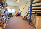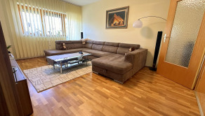 Dolné podlažie: obývacia izba, jedáleň, samostatná kuchyňa, špajza, menšia spálňa, pracovňa, kúpeľňa s vaňou a samostatné WC. Z obývacej izby je výstup na 10 m² balkón, ktorý je slnečný počas celého roka.