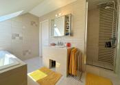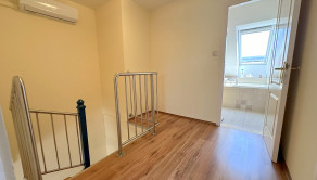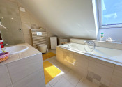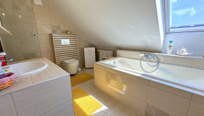 Horné podlažie: dve priestranné spálne (16 m² a 17 m²), šatník a kúpeľňa s vaňou, sprchovým kútom a WC. Výnimočnosťou tejto kúpeľne je okno nad vaňou, ktoré umožňuje výhľad na hviezdy.