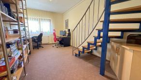Okná a dvere: dolné poschodie má drevené okná s izolačným dvojsklom a vonkajšími roletami, horné poschodie plastové strešné okná s roletami na ochranu pred teplom a svetlom. Interiérové dvere sú drevené s dyhovaným povrchom