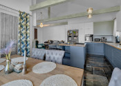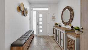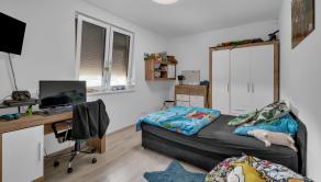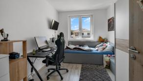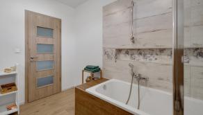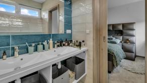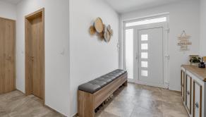 Dispozícia domu: vstupná chodba, spálňa s vlastným šatníkom a kúpeľňou (sprchovací kút, dvojité umývadlo, WC), detská izba, pracovňa, samostatná kúpeľňa s vaňou a WC, priestranná obývacia izba s jedálňou, kuchyňa so špajzou a technická miestnosť.
