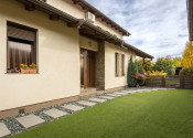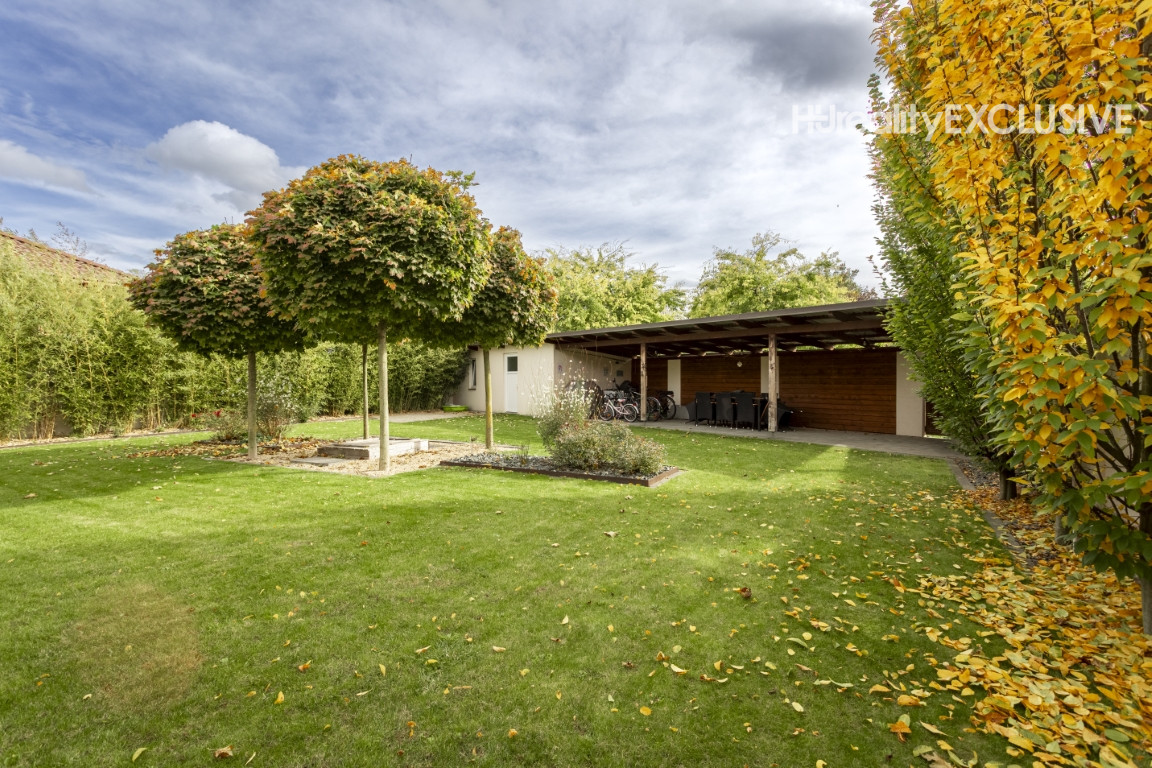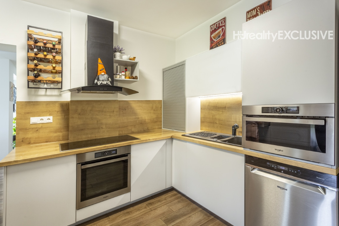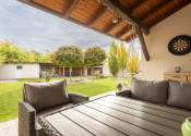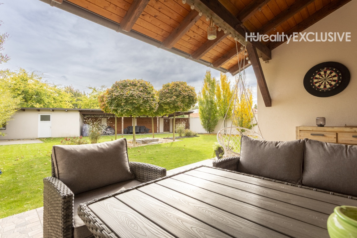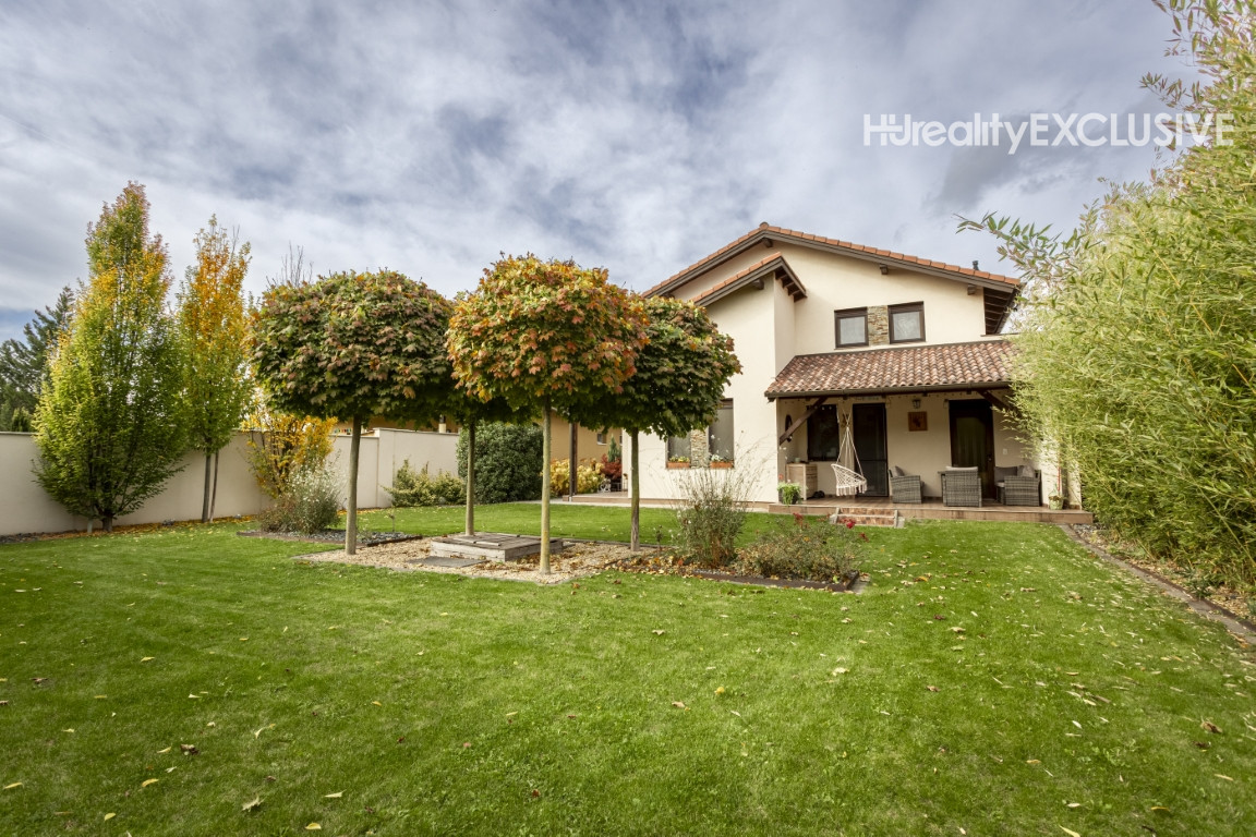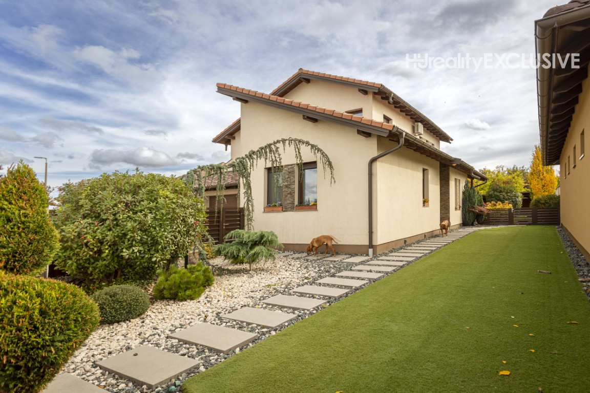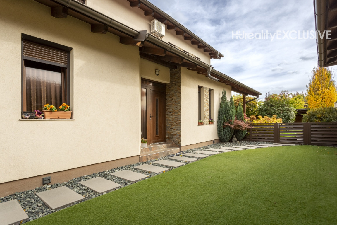 Záhrada bola navrhnutá s ohľadom na štvornohých členov rodiny. Predná časť je pokrytá umelým trávnikom, poskytuje dostatok priestoru na pohyb a zároveň zostáva vždy upravená. Zadná časť záhrady je skutočnou oázou pokoja – vkusne vysadená, so závlahovým systémom, záhradným osvetlením a osvetlenou fontánou, ktoré vytvárajú príjemnú večernú atmosféru. Nachádza sa tu aj samostatný záhradný domček – ideálne miesto pre majstrov a domácich kutilov, s dostatkom úložného priestoru na náradie či sezónne veci.