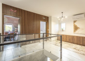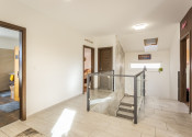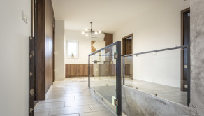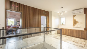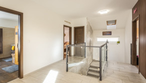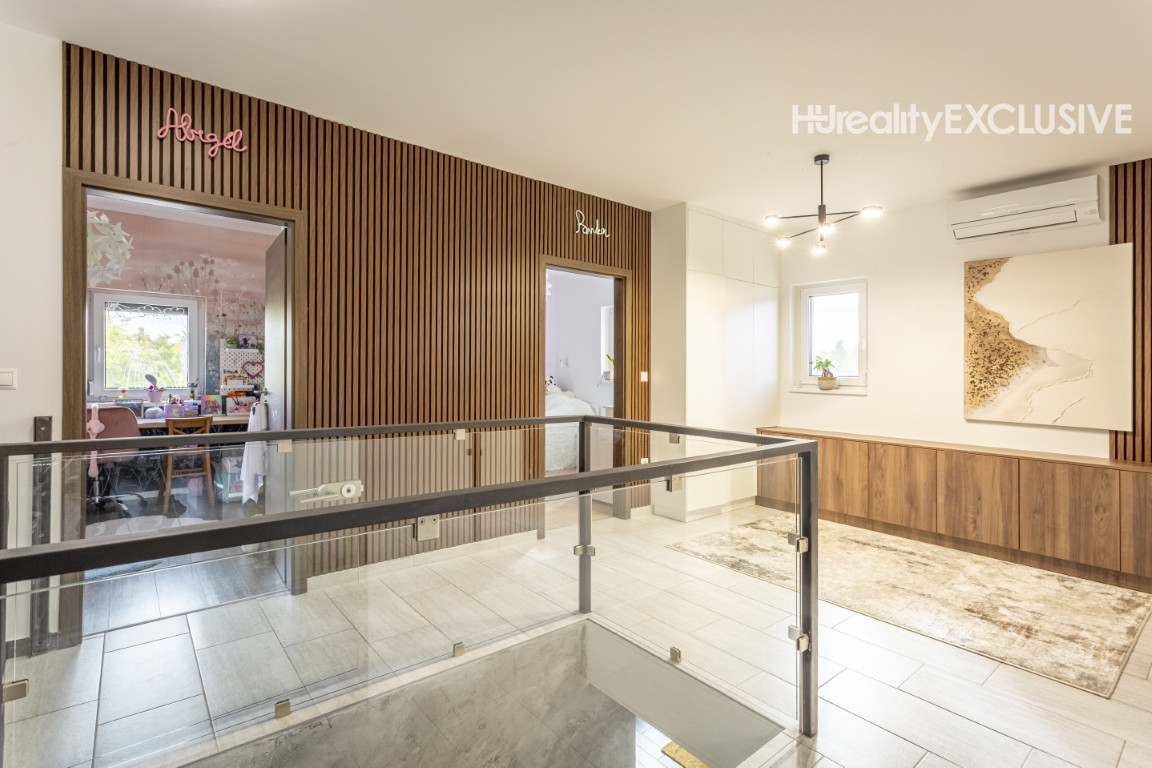 Interiér domu je priestranný a prakticky rozdelený. Celkovo ponúka štyri spálne – tri na poschodí a jednu na prízemí, vďaka čomu možno jednoducho vytvoriť samostatnú rodičovskú alebo detskú zónu. Na každom podlaží sa nachádza kúpeľňa a samostatné WC, pričom horné poschodie ponúka aj infrasaunu pre dokonalý relax. Detské izby aj chodby boli zariadené podľa návrhu interiérového dizajnéra, s dôrazom na praktickosť a estetiku. Na prízemí sa nachádza priestranná obývacia izba prepojená s jedálňou a modernou, plne vybavenou kuchyňou.