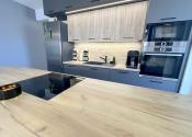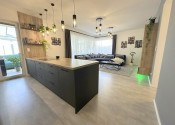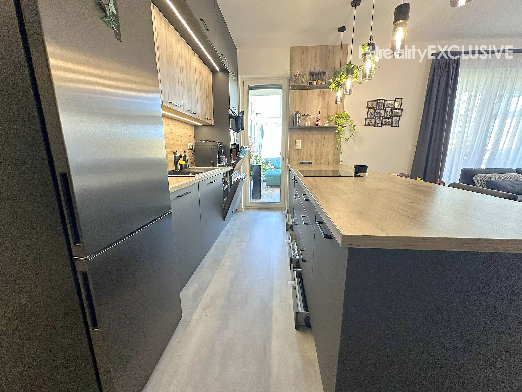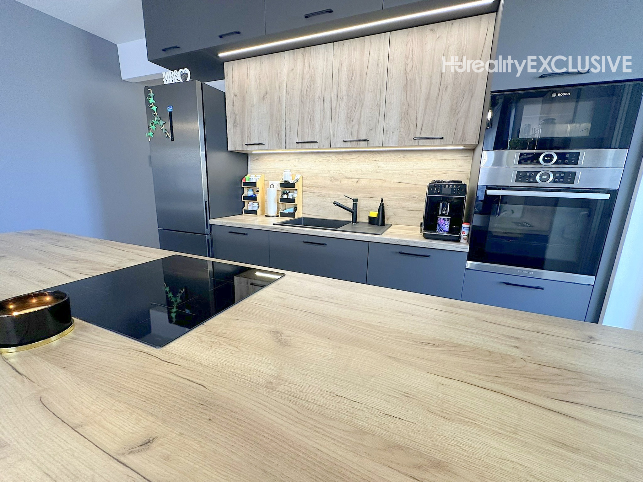 Lesklá, kvalitná kuchynská linka s prémiovými vstavanými spotrebičmi Bosch (rúra, varná doska, digestor, mikrovlnka, umývačka riadu) a kombinovanou chladničkou AEG.