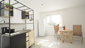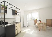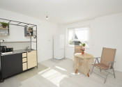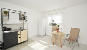 Byt pozostáva z predsiene z ktorej je prístup do všetkých izieb. Slnečná obývacia izba je spojená s kuchyňou, ktorej súčasťou pri predaji je aj mobilná kuchynská linka. Z obývačky aj z izby je prístup na slnečnú terasu s východnou orientáciou. Bytový dom sa nachádza v tichej a kľudnej lokalite Rajky s bezproblémovým prístupom k občianskej vybavenosti mesta. K bytu prislúcha jedno vyhradené parkovacie miesto a spoločný ukladací priestor na chodbe.